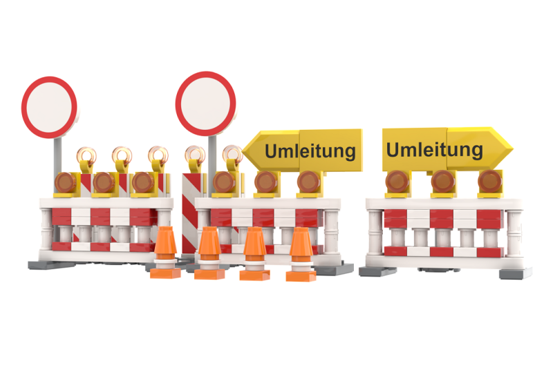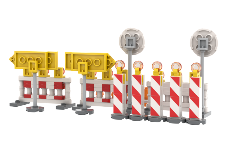 Mit diesem vielseitigen Set aus Klemmbaustein-Straßensperren lassen sich Baustellenszenen realitätsnah nachbauen. Enthalten sind bedruckte Umleitungsschilder, Verkehrshütchen sowie bedruckte Verkehrsschilder – komplett ohne Sticker!