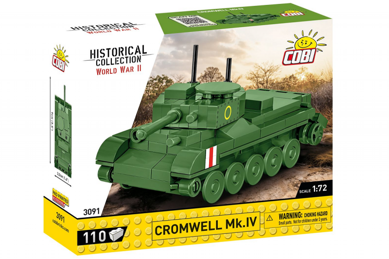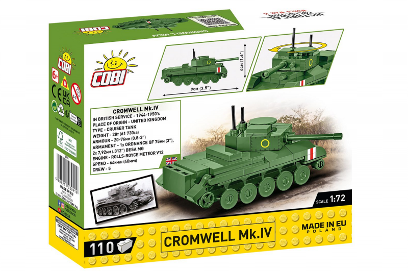 Das Minimodell aus COBI-Bausteinen wurde im Maßstab 1:72 entworfen und besteht aus 110 hochwertigen Elementen. Im gebauten Zustand ist der Tank 9 cm lang. Trotz seiner kompakten Größe hat das Modell alle wichtigen Merkmale seines historischen Vorbilds perfekt beibehalten! An den Seiten des Fahrzeugs sind britische Markierungen aufgedruckt. Dank der montierten Räder kann der Tank bewegt werden. Der Turm des Panzers ist ebenfalls beweglich und kann gedreht werden. Das Modell ist perfekt für einen guten Start in Ihr Abenteuer mit COBI-Bausteinen. Cromwell Mk.IV ist auch für Sammler ein interessantes Modell und Gadget. Es nimmt wenig Platz ein und findet problemlos seinen Platz auf dem Schreibtisch zu Hause, bei der Arbeit oder im Bücherregal. Wenn Sie ein fortgeschrittener Blockdesigner sind, bietet Ihnen das Modell sehr interessante Elemente. Drücken Sie Ihre Leidenschaft durch Klemmbausteine aus und bauen Sie Block für Block Geschichte auf!