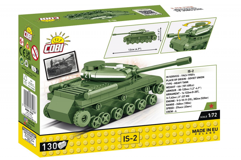 Das Minimodell aus COBI-Bausteinen wurde im Maßstab 1:72 entworfen und besteht aus 130 hochwertigen Elementen. Im gebauten Zustand ist der Tank 12 cm lang. Trotz seiner kompakten Größe behält das Modell alle wichtigen Merkmale seines historischen Vorbilds! Aufgedruckte Markierungen und charakteristische weiße Streifen an den Seiten des Fahrzeugs weisen auf die Teilnahme an der „Aktion Berlin“ hin. Der Turm des Panzers ist beweglich und kann gedreht werden. Der Lauf bewegt sich in der Auf-Ab-Richtung. Das Modell ist perfekt für einen guten Start in Ihr Abenteuer mit COBI-Bausteinen. Auch für Sammler ist der IS-2 Panzer ein interessantes Modell und Gadget. Es nimmt wenig Platz ein und findet problemlos seinen Platz auf dem Schreibtisch zu Hause, bei der Arbeit oder im Bücherregal. Wenn Sie ein fortgeschrittener Blockkonstrukteur sind, bietet Ihnen dieses Modell sehr interessante Elemente. Drücken Sie Ihre Leidenschaft durch Klemmbausteine aus und bauen Sie Block für Block Geschichte auf!