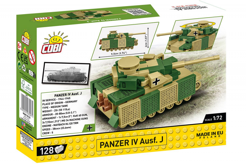 Das Minimodell aus COBI-Bausteinen wurde im Maßstab 1:72 entworfen und besteht aus 128 hochwertigen Elementen. Im gebauten Zustand ist der Tank 9,5 cm lang. Trotz seiner kompakten Größe behält das Modell alle wichtigen Merkmale seines historischen Vorbilds! An den Seiten des Fahrzeugs sind deutsche Markierungen aufgedruckt. Auch Details wie Serviceklappen und Motorbelüftung sind aufgedruckt! Dank der montierten Räder kann der Tank bewegt werden. Der Turm des Panzers ist ebenfalls beweglich und kann gedreht werden. Besonders hervorzuheben sind die für den Panzer IV Ausf. so charakteristischen Seitenabdeckungen von Wanne und Turm.