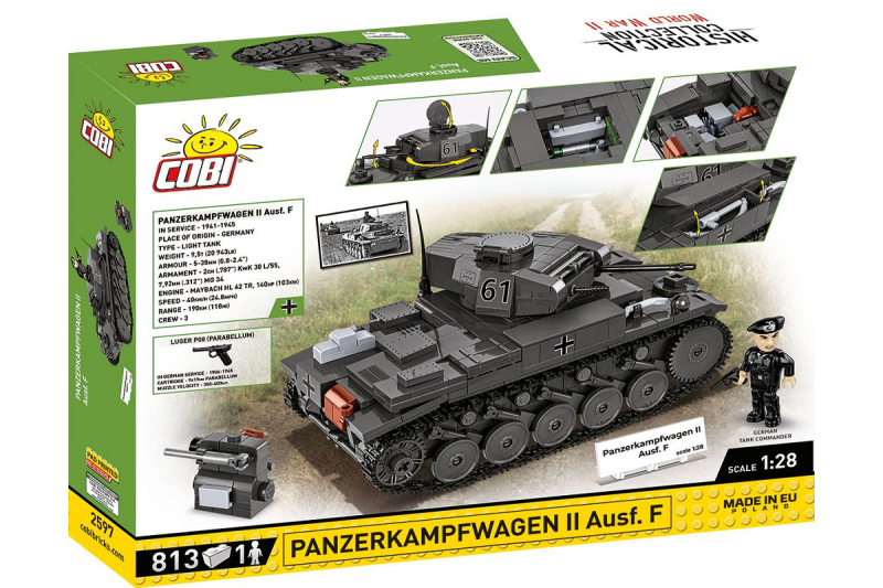 Der Panzerkampfwagen II war einer der wichtigsten deutschen Panzer in der Anfangsphase des Zweiten Weltkriegs. Der Panzer II besteht aus 813 Elementen und ist im Maßstab 1:28 konzipiert. Die Blöcke enthalten hochwertige Aufdrucke, die sich beim Spielen nicht abnutzen. Das Modell verfügt über eine zu öffnende Luke, in der eine Panzerfahrer-Figur platziert werden kann. Der Turm ist um 360 Grad drehbar, das Kanonenrohr mit gekoppeltem Maschinengewehr lässt sich nach oben/unten bewegen. Unter der Serviceklappe befindet sich ein zu bauender Motor, der auch neben dem Modell ausgestellt werden kann. Die Kettentraktion funktioniert, wenn wir den Panzer beim Spielen mit der Hand bewegen. Das Set enthält die Figur eines Panzerfahrers mit Baskenmütze. Der Soldat ist mit einer P08 Parabellum-Pistole ausgestattet. Bauen Sie einen historischen Panzer II aus dem Zweiten Weltkrieg und entdecken Sie seine erstaunlichen Details!
