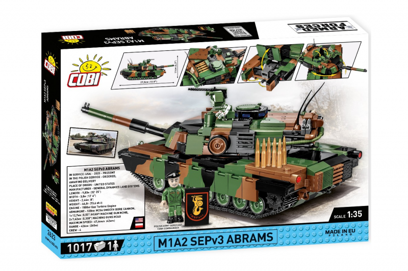 Die modernste Variante des Panzers M1A2 SEPv3 Abrams in den Farben der 1. Panzerbrigade Tadeusz Kościuszko Warschau wurde unter Lizenz des amerikanischen Verteidigungsunternehmens General Dynamics Land Systems entwickelt. Polen hat 250 Panzer dieses Typs bestellt, deren Lieferungen bis 2026 dauern. Jetzt können Sie sehen, wie diese hochmodernen Panzer in der polnischen Armee aussehen werden! Das Blockmodell wurde im sensationellen Maßstab 1:35 mit viel Liebe zum Detail nachgebaut. Möglich wurde dies durch die Verwendung neuer Blöcke aus dem ständig wachsenden Katalog von Elementen, die von der Firma COBI erstellt wurden. Das Modell verfügt über hochwertige Drucke, die die charakteristische „Meerjungfrau“ der 1. Warschauer Panzerbrigade, Nummernschilder und Elemente der Tarnung und Instrumentierung des Panzers darstellen. Das Fahrzeug verfügt über eine funktionierende Kettentraktion, zu öffnende Luken und Zugang zum blockförmigen Motor, der sich unter der Wartungsklappe befindet. Der Fahrzeugturm und der Lauf sind beweglich. Der Abrams-Panzer wurde mit Zubehör wie einem Blocksack, Paketen in einem Korb, Munition und zwei Maschinengewehren angereichert. Das Set enthält eine sorgfältig gestaltete Figur eines Unteroffiziers der 1. Warschauer Panzerbrigade in einem Panzeranzug und mit einem markanten Abzeichen auf der Baskenmütze. Das Ganze wird durch einen speziellen Sammlerstein mit einem aufgedruckten Emblem der 1. Warschauer Panzerbrigade ergänzt.