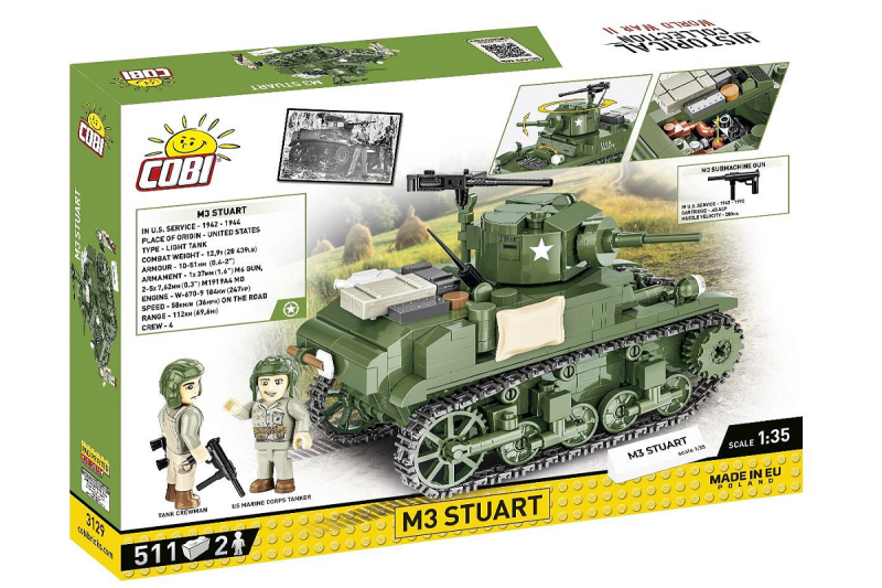 Der Klemmbaustein Stuart wurde sorgfältig im Maßstab 1:35 aus 511 Elementen entworfen. Der Panzer verfügt über eine funktionierende Kettentraktion, einen drehbaren Turm, einen beweglichen Lauf, eine zu öffnende Luke und eine Wartungsluke mit einer Motorattrappe darunter. Das Fahrzeug verfügt über zusätzliche Maschinengewehre an den Seiten sowie Markierungen und Designunterschiede, die den Einsätzen amerikanischer Truppen in Europa, aber auch im Pazifik entsprechen. Sie können den Einsatzort Ihres Fahrzeugs frei wählen!