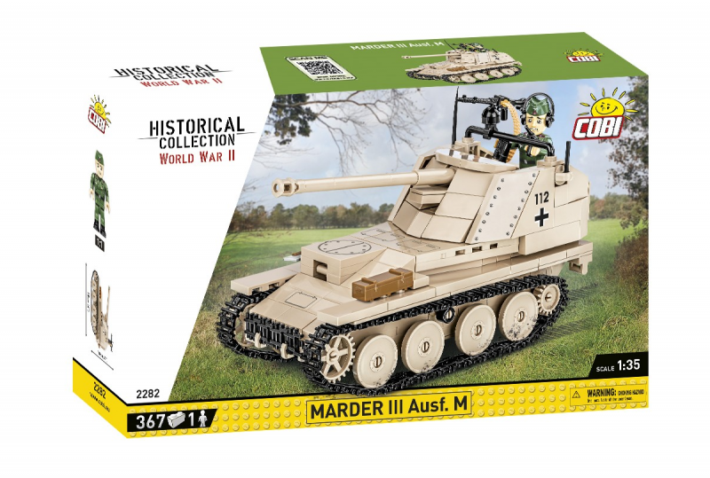 MARDER III Ausf. M wurde passend zu den Figuren im Maßstab 1:35 entwickelt und besteht aus 367 Elementen. Die Verwendung der neuesten Elemente aus dem COBI-Sortiment ermöglichte eine originalgetreue Reproduktion der charakteristischen Formen des Originalfahrzeugs. Zu den Funktionen des Modells gehören: funktionierende Kettentraktion, drehbare Räder, ein Platz für eine Figur im Kampfraum, eine bewegliche Kanone und ein auf einer Schiene montiertes Maschinengewehr. Alle grafischen Elemente sind hochwertige Drucke. Die Figur zeigt einen deutschen Jagdpanzerkommandanten in charakteristischer Uniform. Das Set wird mit einem Schild geliefert, auf dem der Name des Sets aufgedruckt ist. Dieses Set darf in unserer Historical Collection im Maßstab 1:35 nicht fehlen! Bauen Sie eine Geschichte, Stein für Stein!