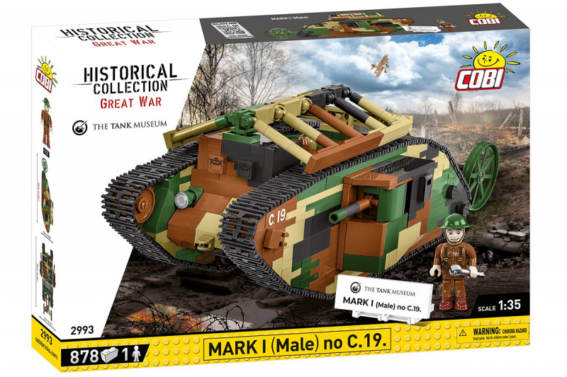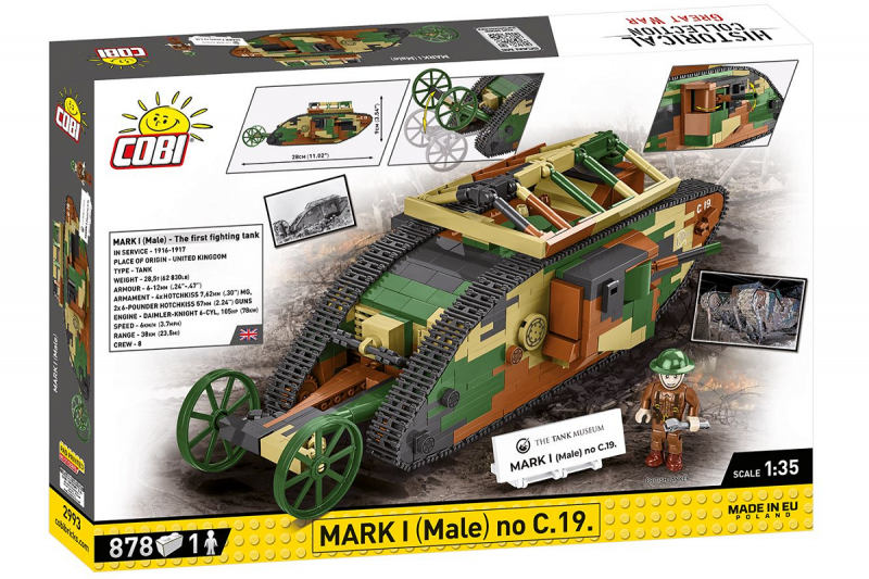 Der Große Krieg läutete die Ära der stählernen Elefanten ein, die bis heute andauert. Damals wurde das Design eines der ersten Panzer geboren! MARK I (männlich) Nummer C.19. Sie bauen es mit 878 COBI-Bausteinen. Das Modell ist 28 cm lang. Dank der Verwendung eines Modellmaßstabs von 1:35 passt das Modell zu COBI-Figuren und anderen in dieser Größe erschienenen Fahrzeugen. Der Panzer ist mit funktionierendem Kettenantrieb, rotierenden Kanonen und zu öffnenden Klappen ausgestattet. Markierungen und Embleme bestehen aus bunten Blöcken und langlebigen Aufdrucken, die sich auch bei intensiver Nutzung nicht abnutzen. Das Set enthält eine Figur eines britischen Panzerfahrers aus der Zeit des Ersten Weltkriegs sowie ein Schild mit dem Namen des Sets und dem Logo des Panzermuseums, das den Originalpanzer beherbergt, nach dem wir dieses Set modelliert haben.