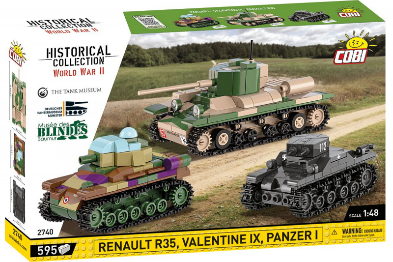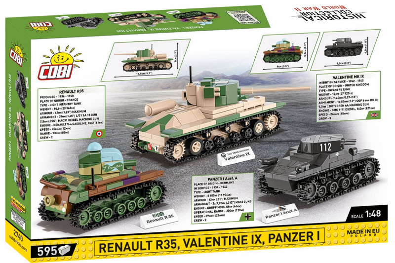Die Panzermodelle wurden sorgfältig aus hochwertigsten COBI-Klemmbausteinen im einheitlichen Maßstab 1:48 entworfen und sind in der Größe aufeinander abgestimmt. Die Modelle verfügen über bewegliche Räder und Ketten sowie um 360 Grad drehbare Türme. Die Klemmbausteine sind mit charakteristischen Markierungen und Fahrzeugdetails bedruckt. Modelle historischer Panzer sind einfach zu bauen. Der gesamte Bauprozess wird durch eine einfache und intuitive Bauanleitung mit einer Liste der Bausteine begleitet. Im gebauten Zustand ist der leichte Panzer British Valentine 14 cm (5,5 Zoll) lang. Der in der Zwischenkriegszeit entworfene deutsche leichte Panzer I war beim Bau 8,5 cm lang. Der in den 1930er Jahren entworfene französische Kampfpanzer R35 war beim Bau 9 cm (3,5 Zoll) lang.