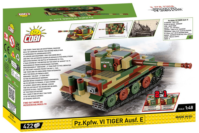 Der Tiger I, auch bekannt als Panzerkampfwagen VI, war einer der gefährlichsten Panzer des Zweiten Weltkriegs. Mit seiner leistungsstarken 88-mm-Kanone und der dicken Panzerung dominierte er ab 1942 die Schlachtfelder. Das vorgestellte Modell zeigt ein Modell mit der Bordnummer 114, das nach der Übernahme durch die Alliierten in die französische Armee eingegliedert wurde und dort den Namen „Bretagne“ erhielt.