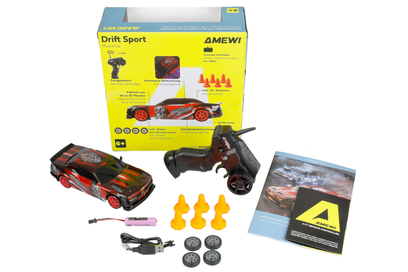 Als RTR-Set (Ready-to-Run) wird das Drift Sport Muscle Car komplett fahrfertig geliefert, inklusive Fernsteuerung, Akku, Ladekabel und sechs Pylonen zum Aufbau einer eigenen Driftstrecke. Damit bietet es alles, was für sofortigen Fahrspaß und realistische Drift-Action benötigt wird.