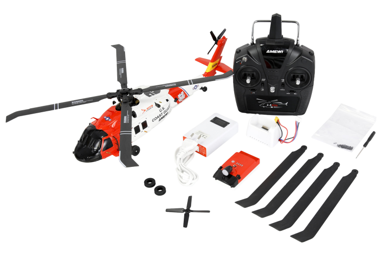 Der UH60 Black Hawk wird als komplettes RTF-Set (Ready-to-Fly) geliefert und ist damit sofort einsatzbereit. Im Lieferumfang enthalten sind eine Fernsteuerung, ein leistungsstarker 1350mAh 3S 11,1V LiPo-Akku für Flugzeiten von bis zu 12 Minuten sowie ein hochwertiges 220V/3A Ladegerät, das auch für andere LiPo- oder Li-Ion-Akkus mit 3-4 Zellen genutzt werden kann. Ersatzrotorblätter, Ersatzreifen und Werkzeug liegen ebenfalls bei, sodass Wartung und kleinere Reparaturen problemlos möglich sind.