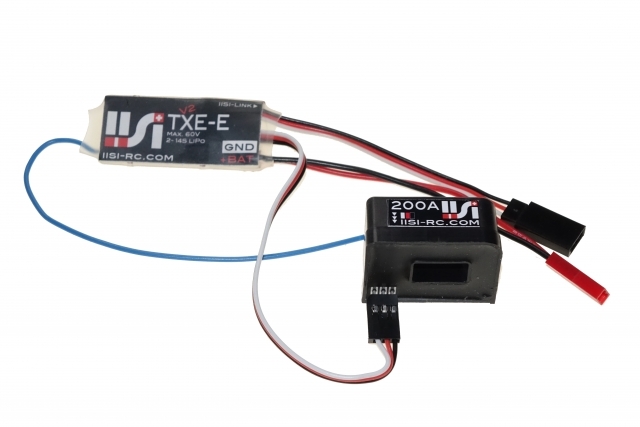 Telemetrie Sender und Spannungs-Sensor, mit externem Strom-Sensor. Strom-Leitung muss nicht aufgetrennt werden; das Kabel wird einfach durch den Sensor geführt. 6-60V / 2-14S Lipo,