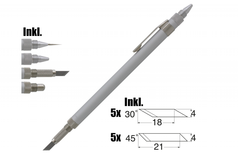 Profi-Präzisions-Cuttermesser für feine Schneidarbeiten in Papier, Pappe, Kunststoff, usw. Das Messer ist komplett aus Aluminium gefertigt. Mit 2 verschiedenen Spitzen zum Durchrubbeln von Selbstklebebuchstaben. Mit Klingenhalterung und Edelstahl-Punktierspitze, welche bei Nichtgebrauch durch Umschrauben im Griff verschwindet. mit praktischem Clip. Inkl. 5 Klingen 30° und 5 Klingen 45° abgewinkelt in praktischer Aufbewahrungsbox.